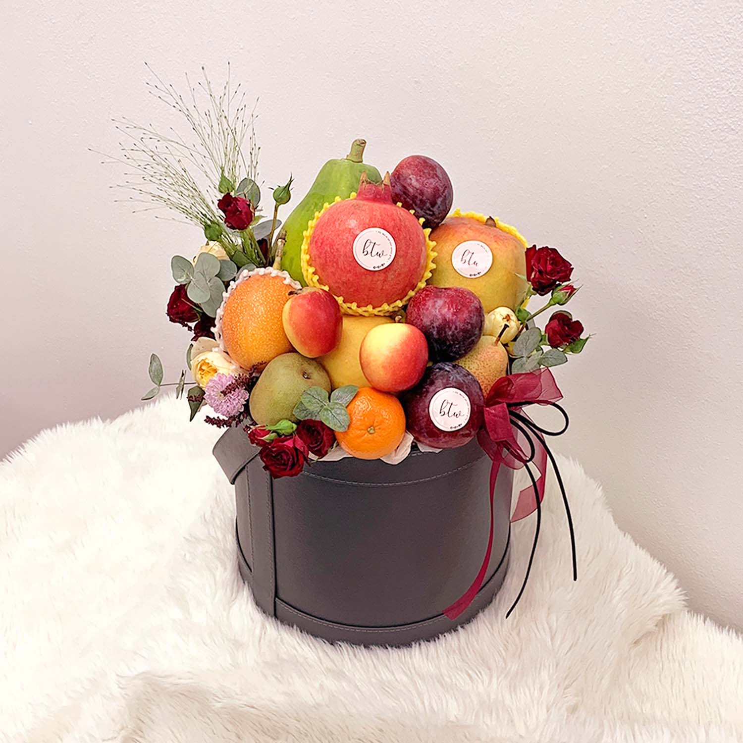 Consists of Australia R2E2 Mangoes, Taiwan Sweet Pears, Australia Rockit Apple, Philippines Mini Papaya, Ecuador Yellow Passionfruit, China Red Heart Kiwi, Spain Black Plums, Chuna Pomegranate, South Africa Cape Blush Pear, accompanied by Blood Red Bubble Rose Spray, Light Pink Mini Pom, Red Astilbe, Fountain Grass Rose, Champagne Rose Spray and Eucalyptus Populus in a Grey Bucket Holder.
